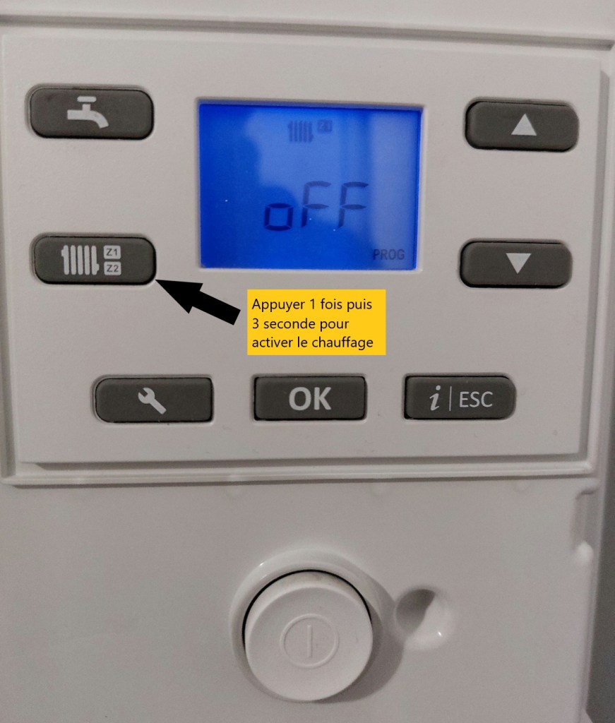 Sur votre chaudière appuyer sur le bouton Radiateur 1 fois puis pendant 3 seconde. Appuyer 1 nouvelle fois jusqu’à ce que l’indication « OFF » n’apparaisse plus.