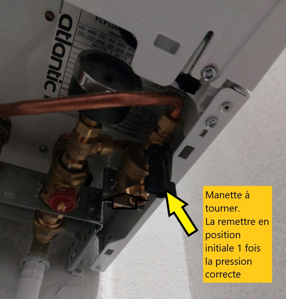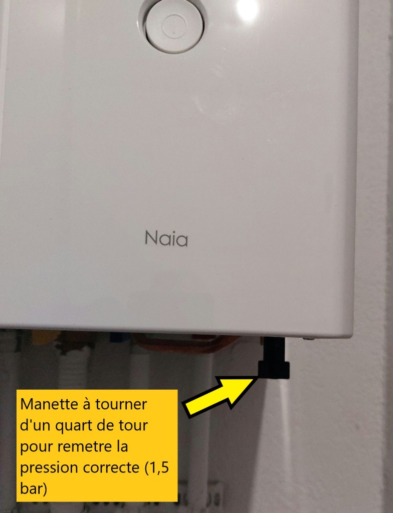 Dans ce cas il faut tourner une manette sous la chaudière pour remettre à niveau (entre 1 et 1,5 bar) et surtout ne pas oublier de la remettre en position initiale une fois la pression suffisante atteinte
