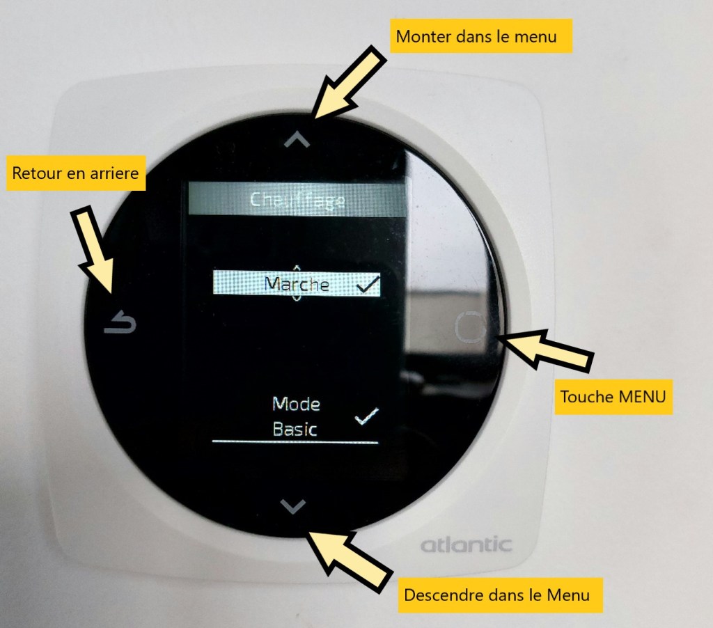 Pour enclencher le chauffage sur ce Thermostat appuyez sur la touche « Menu » à droite. Avec les touche « haut » et « bas » déplacez vous dans le Menu pour sélectionner « marche » et « Mode Basic » revenez ensuite à l’écran d’accueil avec la touche « Retour », vous obtiendrez l’écran suivant :