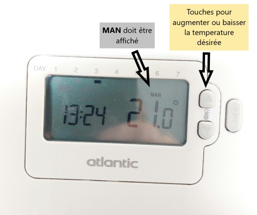 Sur le mur de l’entrée ou du salon vous devez avoir un thermostat fixé au mur, il peut exister plusieurs modèles. Suivez les instructions ci-dessous suivant le modèle installé chez vous :
